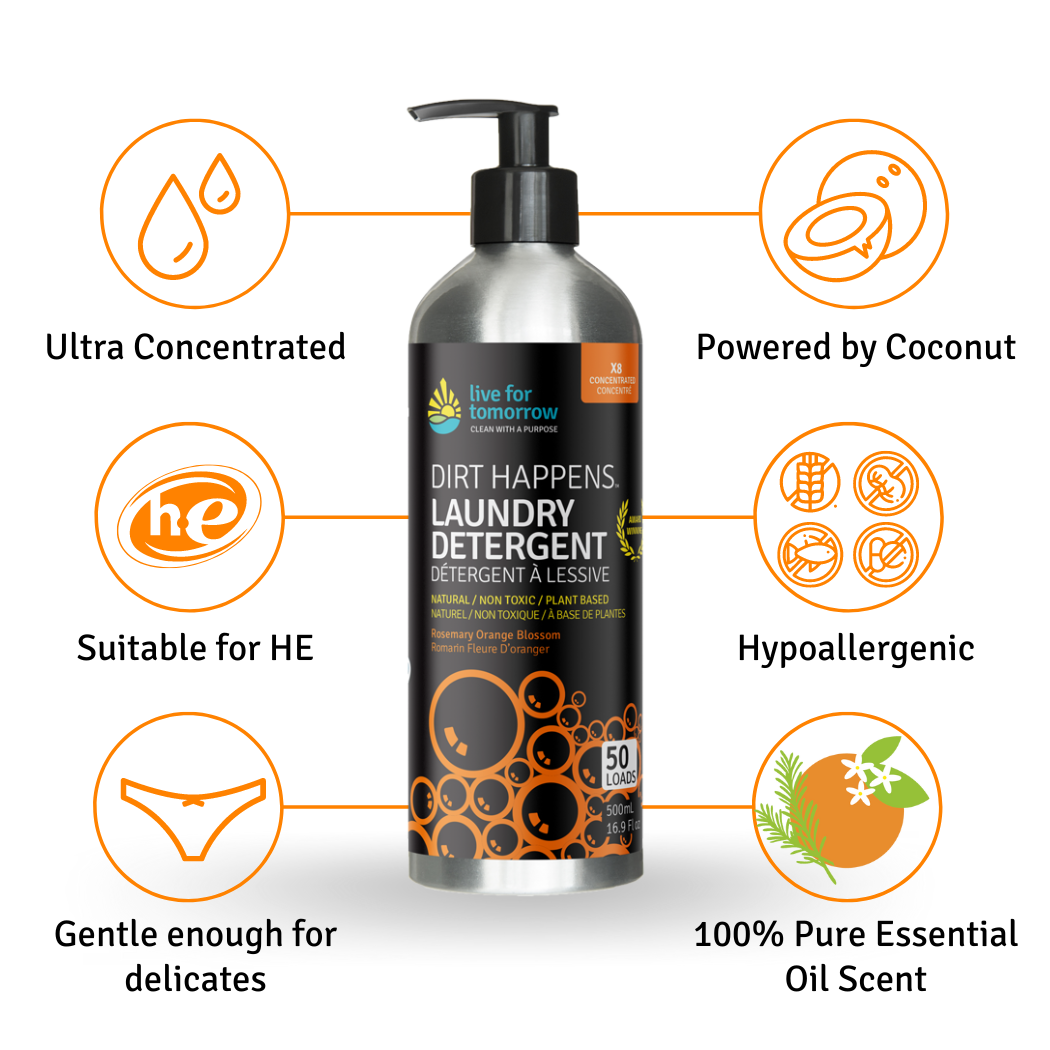 Kick toxins to the curb using Live for Tomorrow (LFT)’s all-natural Coconut based “Dirt Happens” liquid laundry detergent in Rosemary Orange Blossom. This refreshing combination is derived from 100% pure essential oils. And 8X concentrated means you’ll get 50 wash loads from one small bottle, or 150+ from the refill sizes!