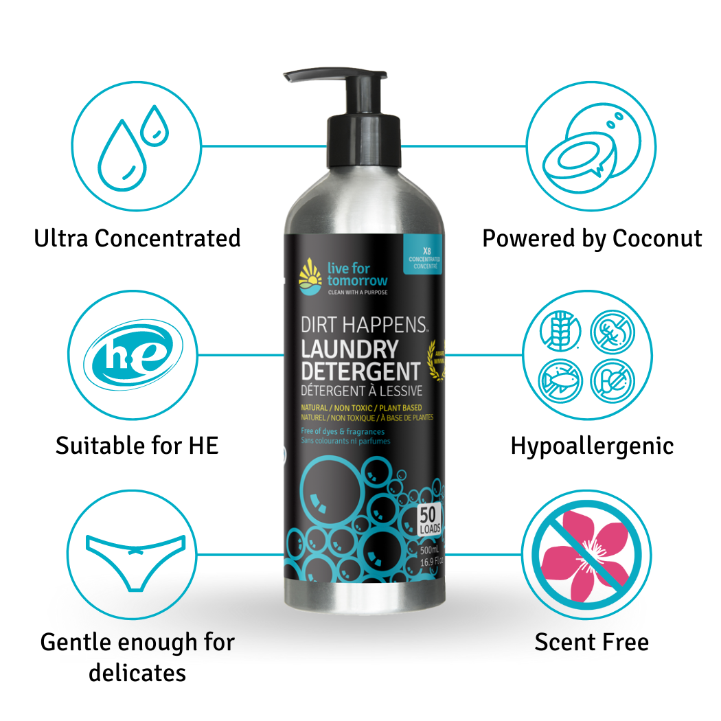 Coconut based and 8x concentrated, Live for Tomorrow (LFT) liquid laundry detergent “Dirt Happens” delivers results you can rely on. Our Unscented formula is ideal for those in need of smart fragrance-free cleaning solutions. Live for Tomorrow is perfect for sensitive skin, sensitive noses, and a sensitive planet. And, 8X concentrated means you’ll get 50 wash loads from one small bottle, or 150+ from the refill sizes!
